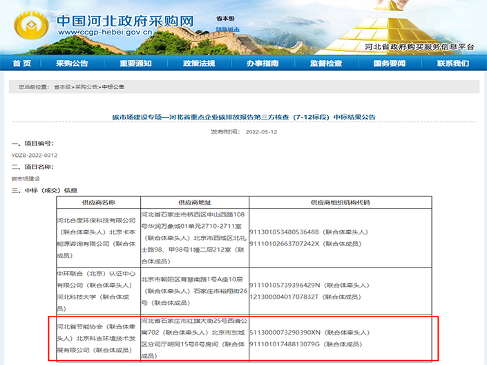 2022年5月12日,河北省政府采購網(wǎng)公布了“碳市場建設(shè)專項(xiàng)—河北省重點(diǎn)企業(yè)碳排放報(bào)告第三方核查(7-12標(biāo)段)”中標(biāo)結(jié)果公告,科吉與河北省節(jié)能協(xié)會組建的聯(lián)合體成功中標(biāo)。 科吉是國內(nèi)最早從事重點(diǎn)排放單位碳排放核查...