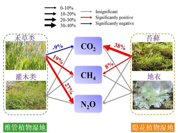 不同優(yōu)勢植物功能群濕地,二氧化碳、甲烷和氧化亞氮三種溫室氣體凈交換對增溫的響應(yīng)?!≈锌圃捍髿馑?供圖 中新網(wǎng)北京3月21日電 (記者 孫自法)全球增溫對濕地的溫室氣體“匯”(簡稱碳匯)功能有沒有影響?有何影...