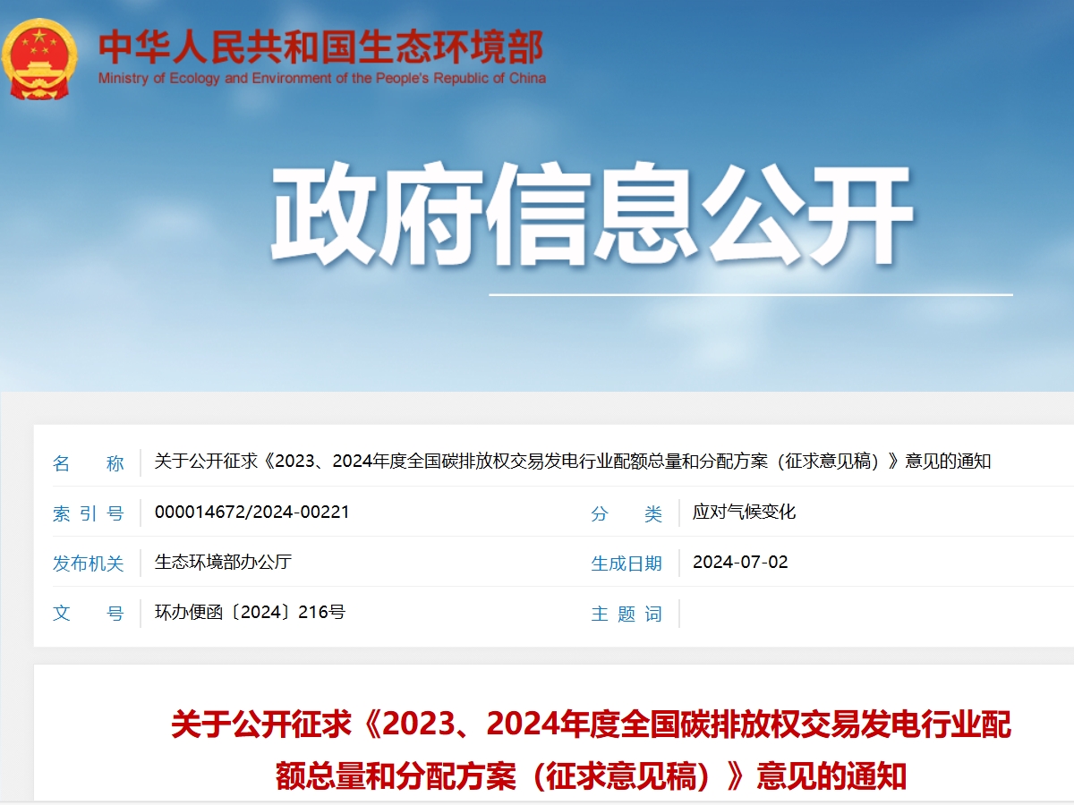關(guān)于公開(kāi)征求《2023、2024年度全國(guó)碳排放權(quán)交易發(fā)電行業(yè)配額總量和分配方案(征求意見(jiàn)稿)》意見(jiàn)的通知 為加強(qiáng)全國(guó)碳排放權(quán)交易市場(chǎng)建設(shè)管理,做好發(fā)電行業(yè)2023、2024年度配額分配相關(guān)工作,根據(jù)《碳排放權(quán)交易管...