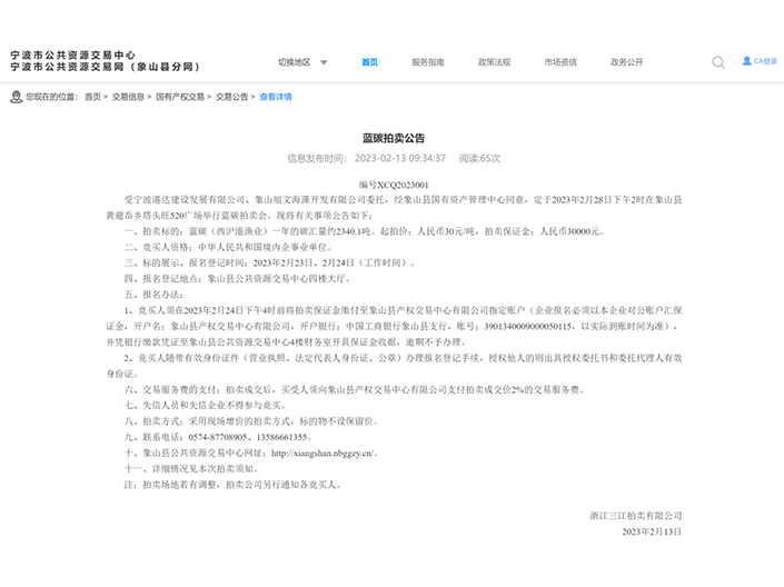 全國首單藍碳拍賣交易將在海洋大縣象山舉行。2月13日,寧波市公共資源交易網(wǎng)(象山縣分網(wǎng))發(fā)布《藍碳拍賣公告》,將對藍碳(西滬港漁業(yè))一年的碳匯量約2340.1噸進行拍賣。此次拍賣面向全國企事業(yè)單位,藍碳拍賣會...