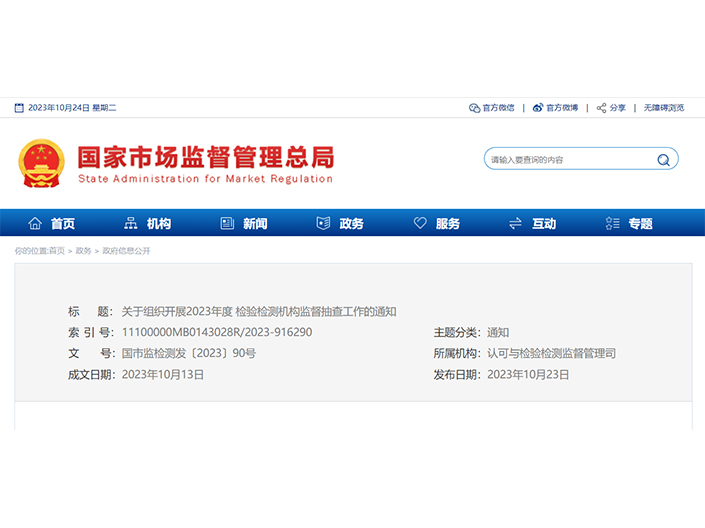 關(guān)于組織開(kāi)展2023年度檢驗(yàn)檢測(cè)機(jī)構(gòu)監(jiān)督抽查工作的通知國(guó)市監(jiān)檢測(cè)發(fā)〔2023〕90號(hào)各省、自治區(qū)、直轄市和新疆生產(chǎn)建設(shè)兵團(tuán)市場(chǎng)監(jiān)管局(廳、委)、公安廳(局)、自然資源廳(委、局)、生態(tài)環(huán)境廳(局)、交通運(yùn)輸廳(...
